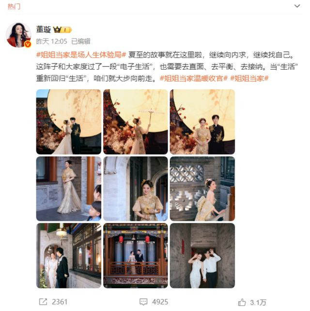 董璇曝光出来的这组结婚照,既是和大家分享她的幸福时刻,同时也是为她最近参加录制的综艺《姐姐当家》收官划上一个圆满的句号。