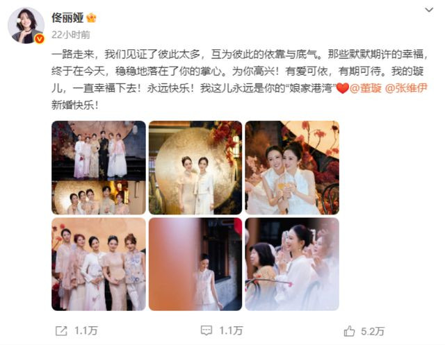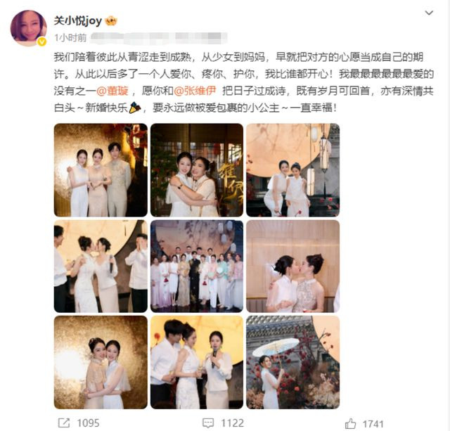 除了佟丽娅以外,同样作为董璇闺蜜的女演员、佟大为的妻子关悦,在9月28日也发文为董璇送上了祝福,她在发文中写道:“愿你和张维伊把日子过成诗,既有岁月可回首,亦有深情共白头,新婚快乐,要永远做被爱包裹的小公主,一直幸福!”